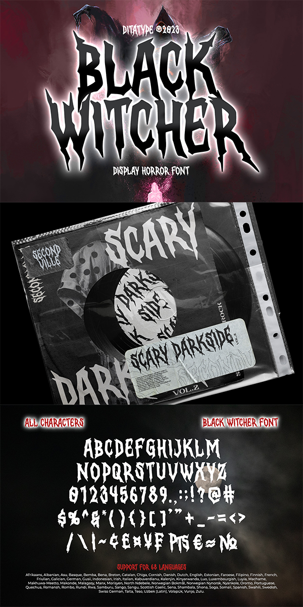 Black Witcher fits in headlines, logos, movie posters, flyers, invitations, branding materials, print media, editorial layouts, headers, and any horror-themed project. Find out more ways to use this font by taking a look at the font preview.