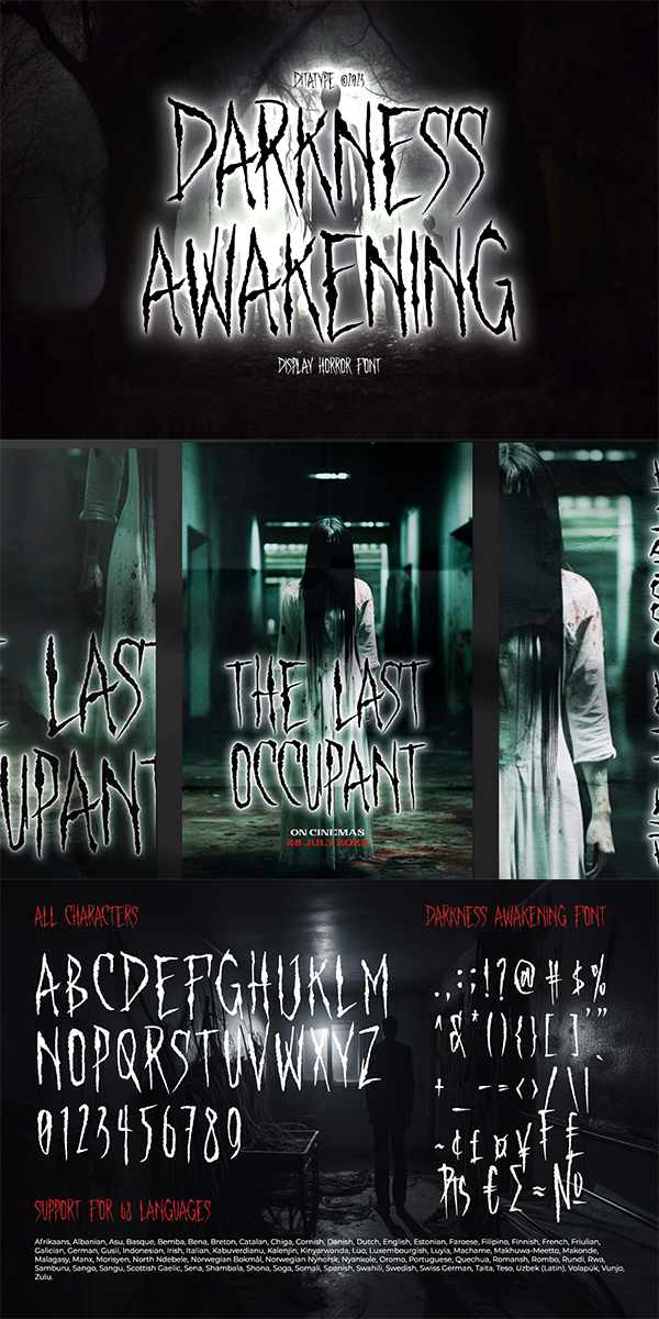 Darkness Awakening fits in headlines, logos, movie posters, flyers, invitations, branding materials, print media, editorial layouts, headers, and any horror-themed projects. Find out more ways to use this font by taking a look at the font preview.