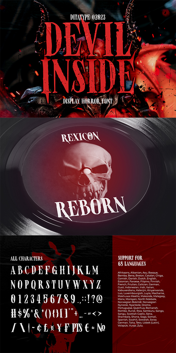 Devil Inside fits in headlines, logos, movie posters, flyers, invitations, branding materials, print media, editorial layouts, headers, and any horror-themed project. Find out more ways to use this font by taking a look at the font preview.