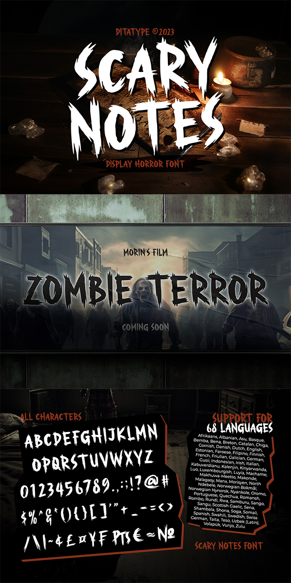 Scary Notes fits in headlines, logos, movie posters, flyers, invitations, branding materials, print media, editorial layouts, headers, and any project that requires a terrifying touch. Find out more ways to use this font by taking a look at the font preview.