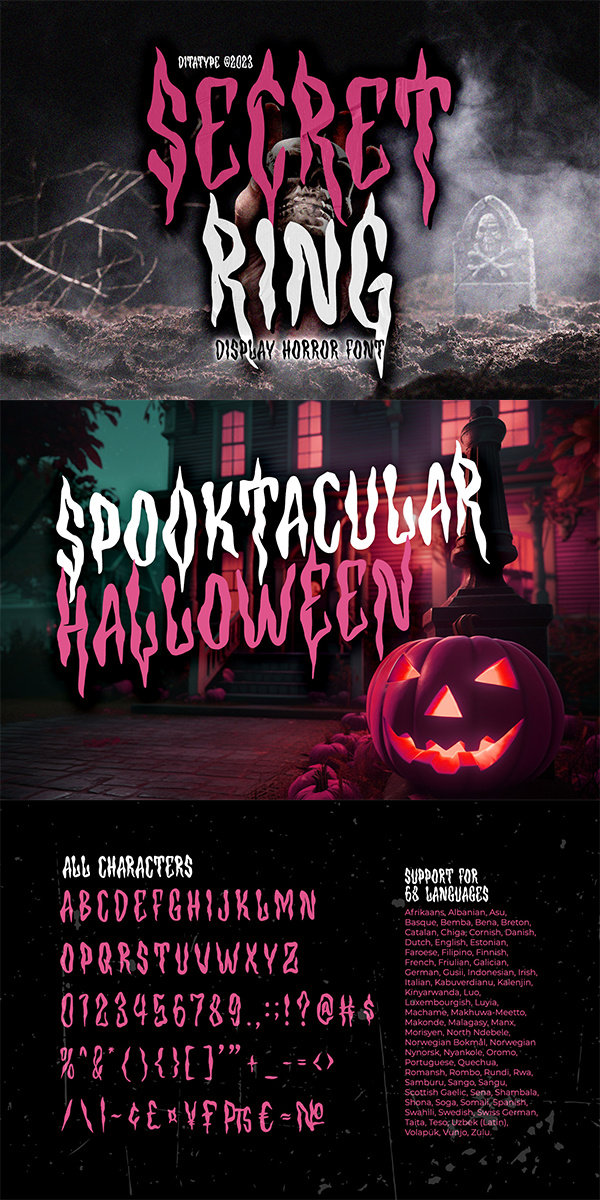 Secret Ring fits in headlines, logos, movie posters, flyers, invitations, branding materials, print media, editorial layouts, headers, and any horror-themed project. Find out more ways to use this font by taking a look at the font preview.