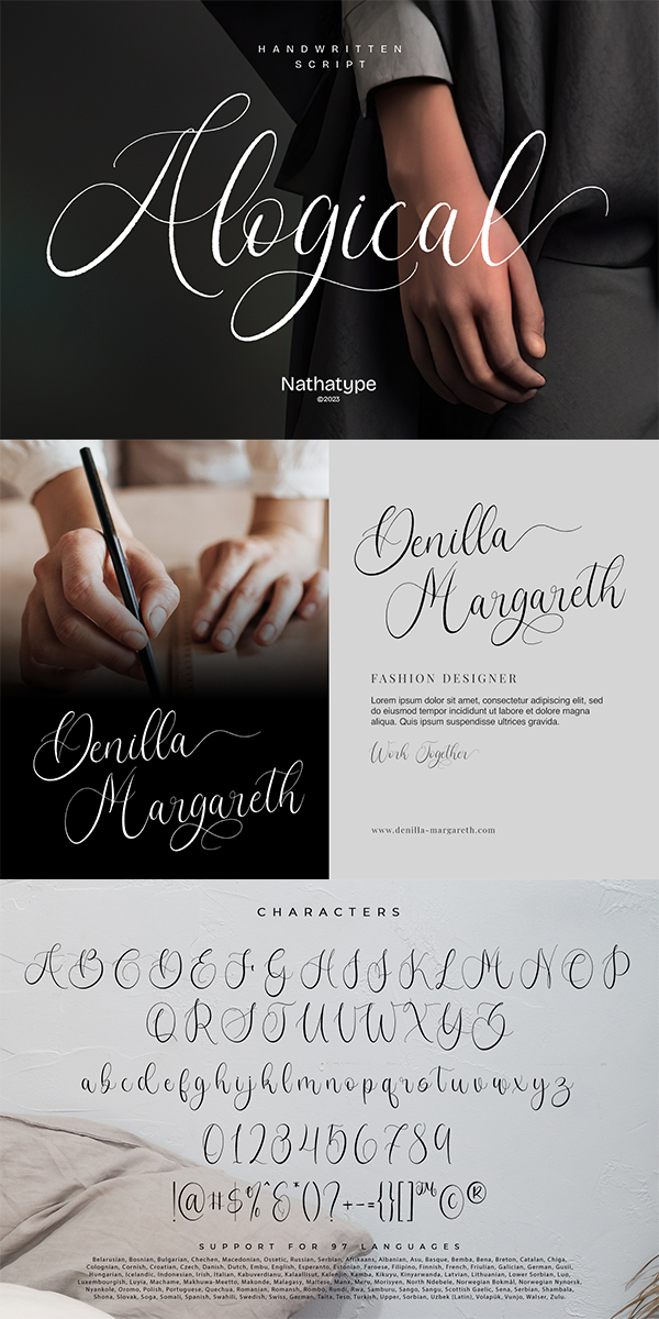 Alogical is a captivating script font that beautifully captures the essence of cursive handwriting with a touch of eloquence. Each letter in Alogical is meticulously crafted with high contrast outlines, adding a dynamic and eye-catching quality to the font. The combination of bold strokes and delicate lines creates a sense of fluidity and elegance, enhancing the overall visual appeal. The swaying circular finish lines in Alogical bring a sense of movement and grace to the font. These captivating details add a flourish of creativity and uniqueness, making the script come to life with a touch of playfulness. With its smooth and flowing letterforms, Alogical offers a natural and seamless writing style, evoking the charm of handwritten notes. For the best legibility you can use this font in the bigger text sizes. Enjoy the available features here.