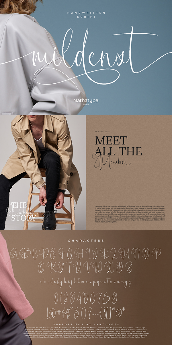 Mildenst is a script font that embodies the essence of flowing cursive handwriting. The subtle variation in line weight, combined with the delicate curves and loops, imbues the font with a natural appearance. The swinging letter details evoke the mesmerizing rhythm of handwritten strokes. The carefully balanced spacing ensures readability while preserving the authentic feel of cursive handwriting. In addition, you can enjoy the available features here.
