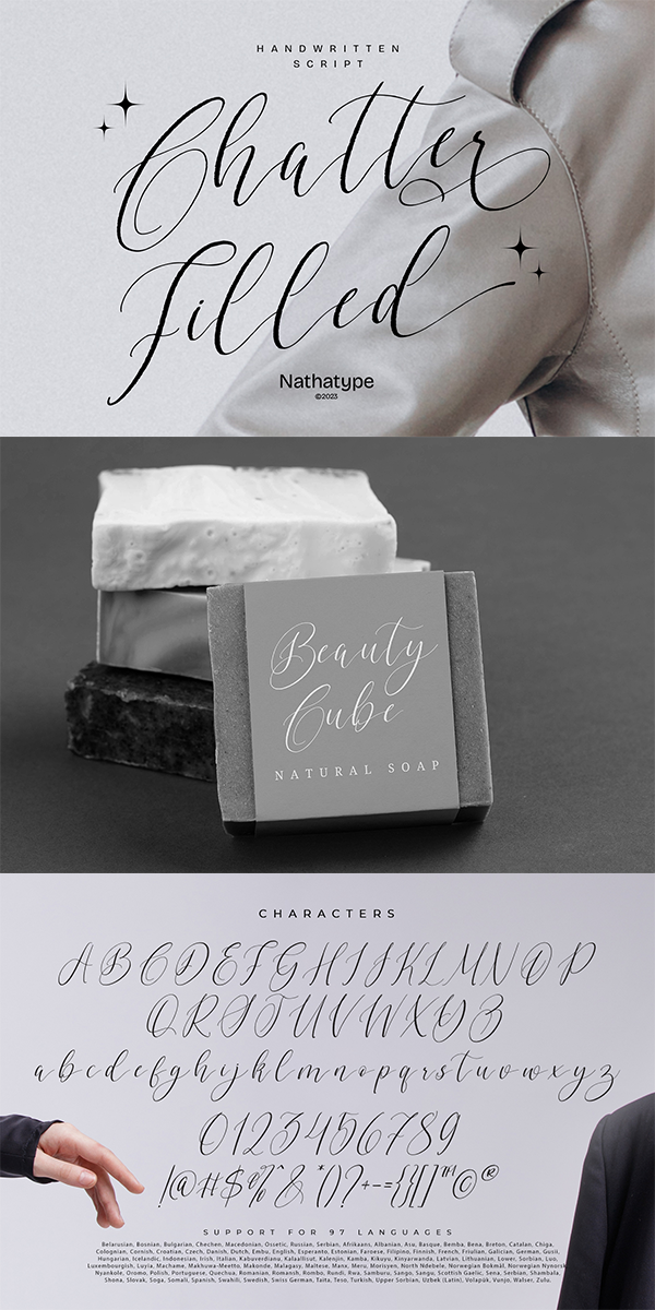 Chatter Filled is a captivating script font that beautifully captures the essence of cursive handwriting with a touch of individuality. This typeface exudes a sense of liveliness and creativity. Each letter in this font is meticulously crafted with varying heights, creating a playful contrast that adds a dynamic to the font. The irregular proportions of the letters enhance the font’s overall visual appeal, giving it an artisanal and handcrafted feel. With its mix of tall and short letters, Chatter Filled brings a sense of movement and spontaneity to the text. The carefully balanced spacing ensures readability while preserving the authentic feel of cursive handwriting. But for the best legibility use this font in the bigger text sizes. Enjoy the available features here.