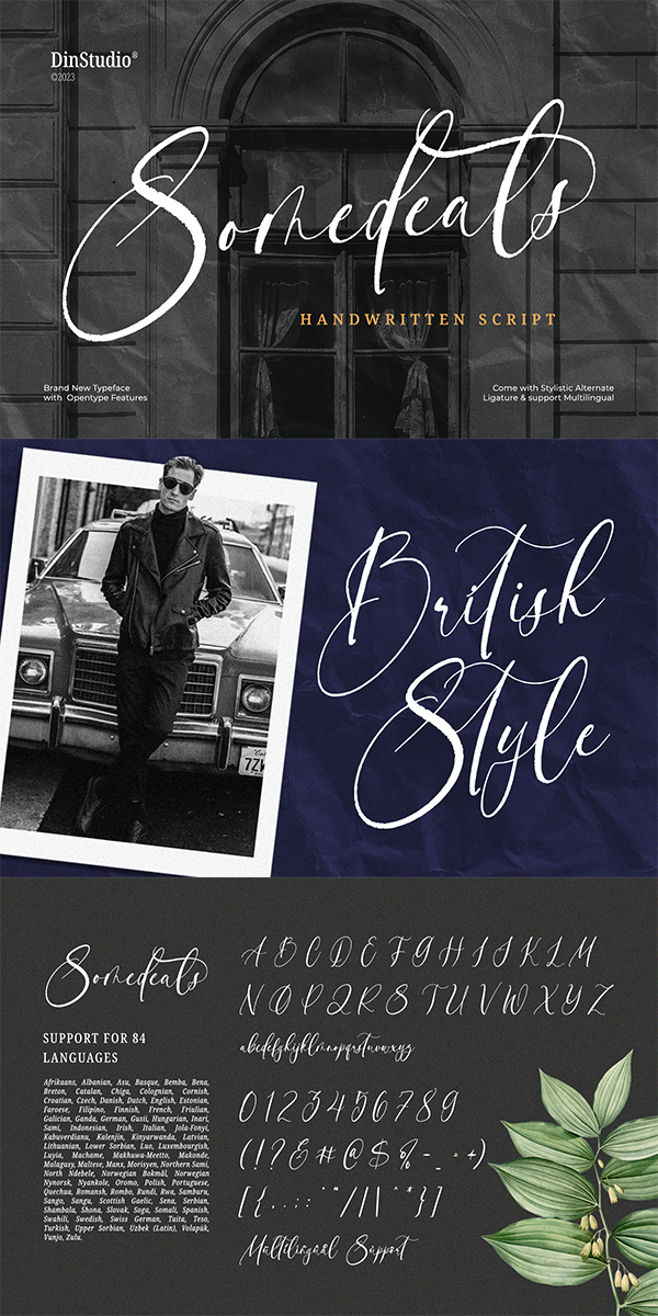 Somedeals is a captivating script font that beautifully captures the essence of cursive handwriting with a touch of elegance. With its smooth and fluid letterforms, Somedeals offers a natural and seamless writing style, evoking the charm of handwritten notes. The high letter contrast in this font adds a dynamic and eye-catching quality, enhancing the overall visual appeal and making each word stand out. For the best legibility you can use this font in the bigger text sizes. In addition, enjoy the available features here.