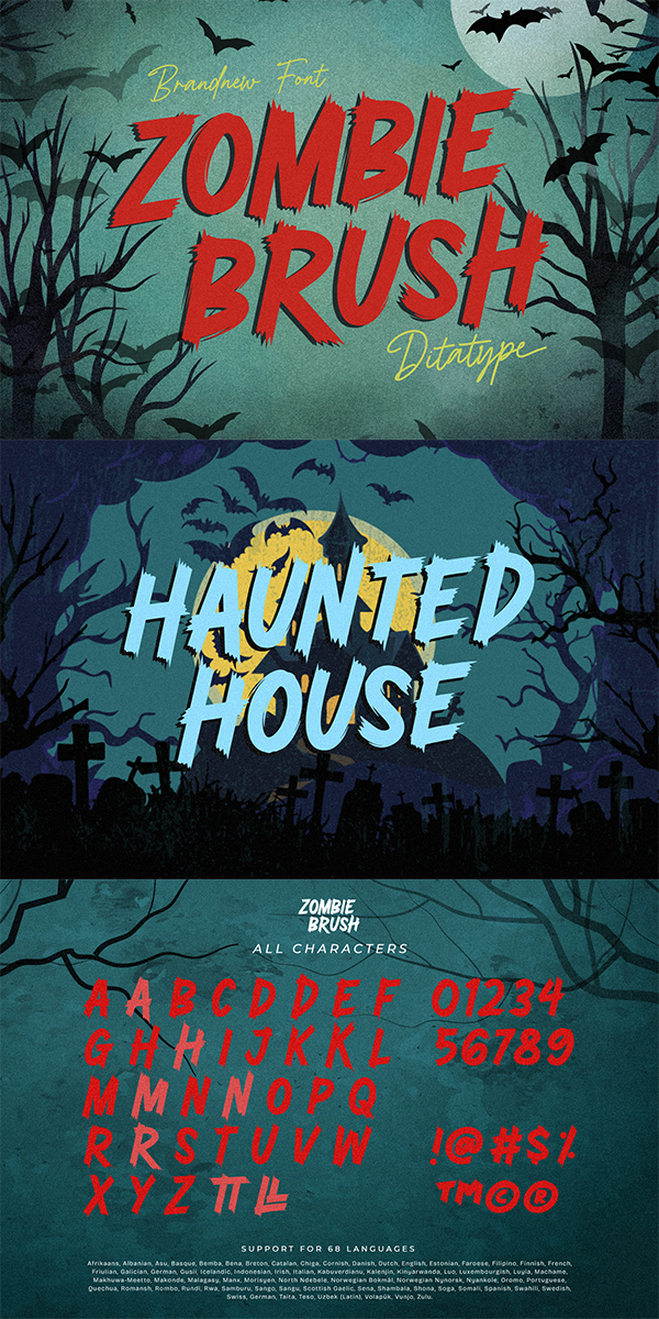 Zombie Brush fits in headlines, logos, movie posters, flyers, branding materials, print media, editorial layouts, headers, and zombie-themed projects. Find out more ways to use this font by taking a look at the font preview.