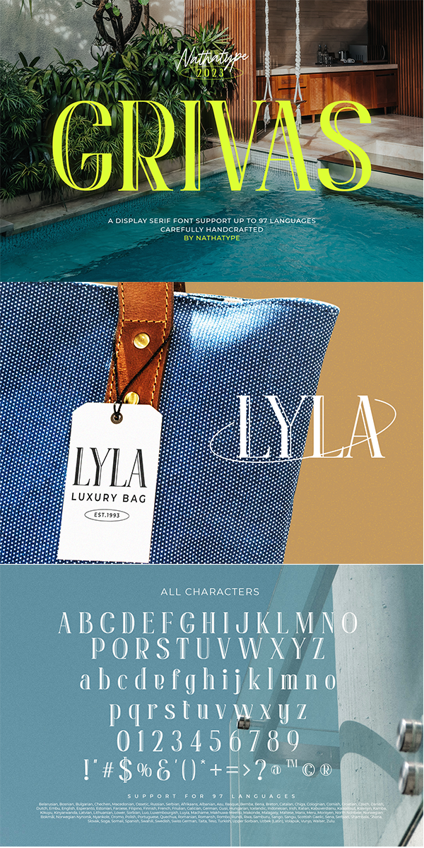 Grivas, a serif display font that redefines typographic elegance with its distinctive dual-contrast design. Each letter of Grivas is a work of art, meticulously crafted with two distinct outlines that harmoniously coexist. One outline boasts a refined delicacy, evoking a sense of timeless sophistication, while the other exhibits bold strokes that command attention and add a modern twist. The seamless fusion of these two contrasts results in a captivating tapestry of serifs that is both classic and contemporary. For the best legibility use this font in the bigger text sizes. Enjoy the features here.