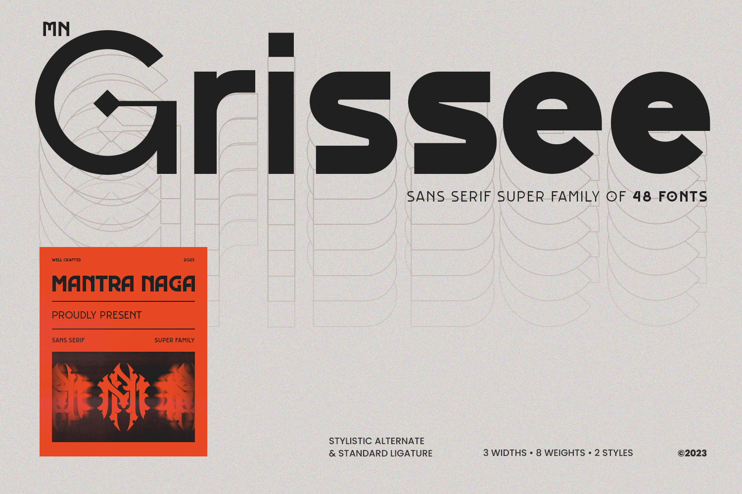 MN Grissee is a new sans serif font family with versatility in mind. With 436 glyphs and rounded facets, this typeface covers all types of web and graphic design projects. This font family contains 48 fonts divided into 3 widths, 8 weights, and 2 styles with a variety of professional Opentype functions such as pro kerning, stylistic alternates, swash, standard ligature, also multilingual support.