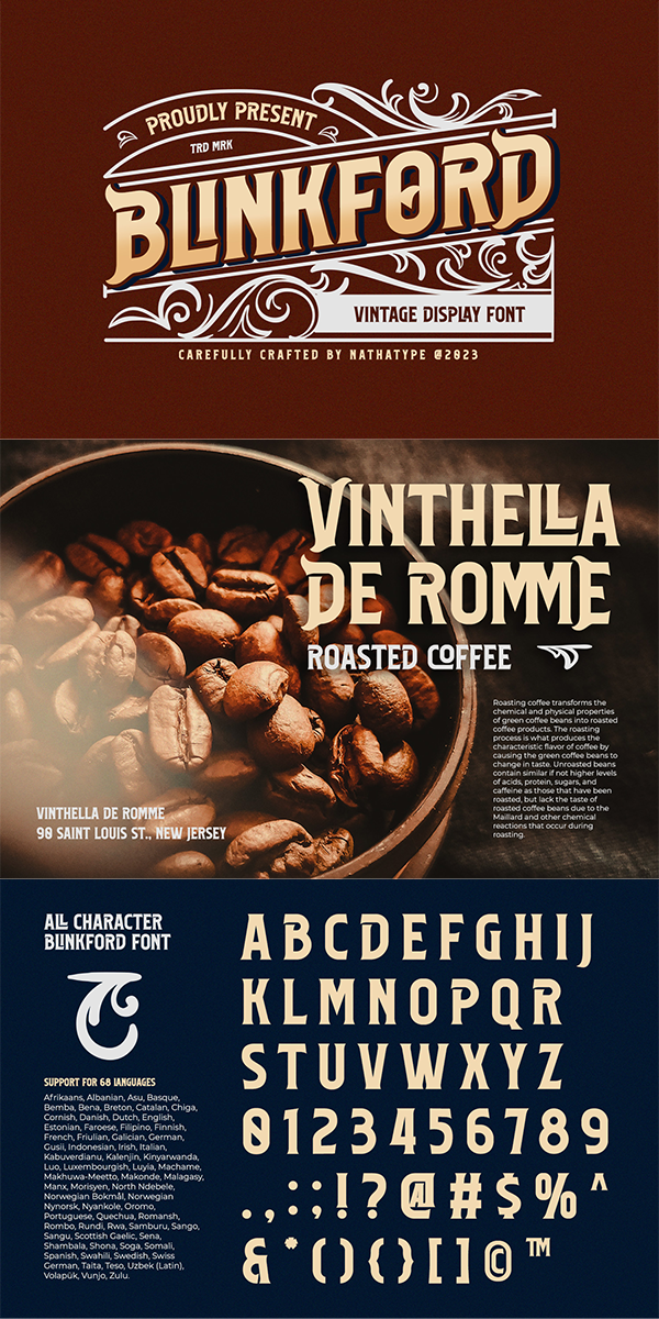 Step back in time and embrace the nostalgic allure of Blinkford, a captivating uppercase display font that transports you to an era of timeless elegance and vintage charm. The characters are bold and robust, evoking a sense of grandeur and prominence that harks back to a bygone era. The generous spacing in Blinkford is designed to give your text room to breathe. This open layout enhances legibility and imparts a sense of spaciousness that is characteristic of vintage typography. As a special bonus, this font includes ornaments. In addition, enjoy the features here.