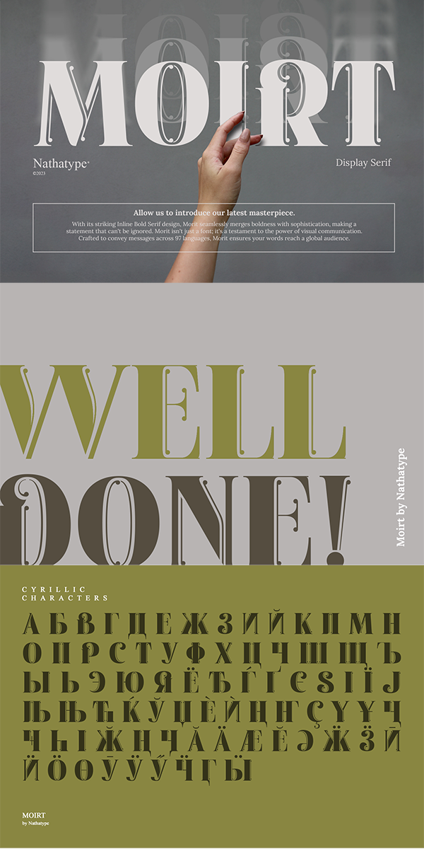 The generous spacing in Moirt ensures that each character has room to breathe. This spacious layout enhances legibility and gives the font a contemporary, open feel. What truly sets Moirt apart is its inline design. Delicate lines run parallel to the edges of the letters, adding a unique and captivating visual element. This inline detail adds depth and dimension to the font, creating an intriguing contrast with its heavy weight and bold serifs. Enjoy the features here.