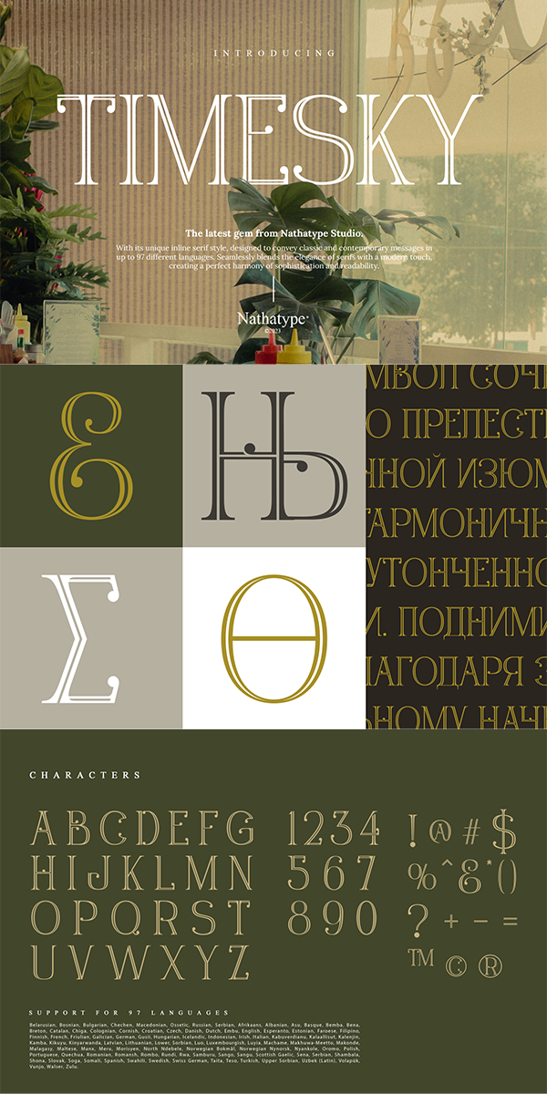 The ample spacing not only enhances legibility but also lends a feeling of openness and modernity to your design. What sets Timesky apart is its unique inline design. The inline style brings a sense of depth and dimension to the font, creating a captivating visual. Enjoy the features here. Moreover, enjoy the available features here.