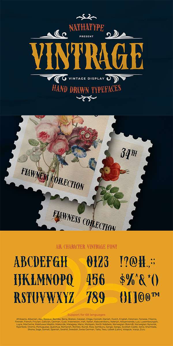 One of Vintrage’s most distinctive characteristics is its textured outline. The edges of each letter have a slightly rough and imperfect quality, evoking the look of vintage letterpress printing or weathered signage. Beautiful ornaments are included as a bonus. In addition, the features here.