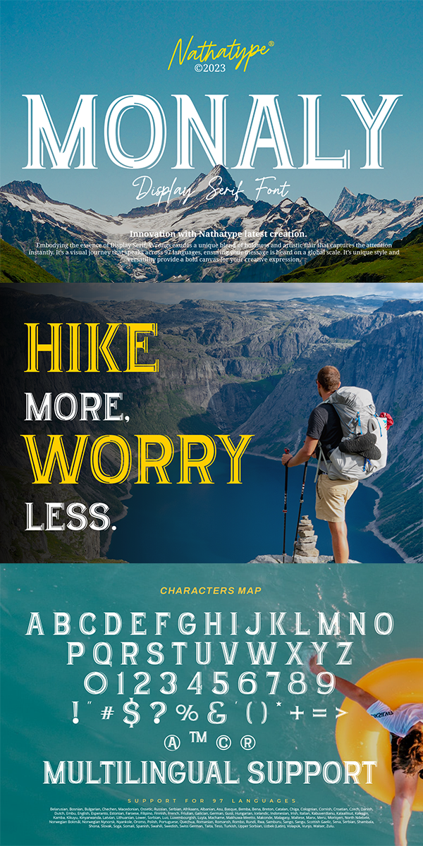 The artistic flair of Monaly is evident in its carefully balanced letterforms, which blend tradition with a contemporary edge. The font’s heavy weight adds a sense of weightiness and substance, making it a reliable choice for conveying gravitas and authority in your designs. Enjoy the features here.