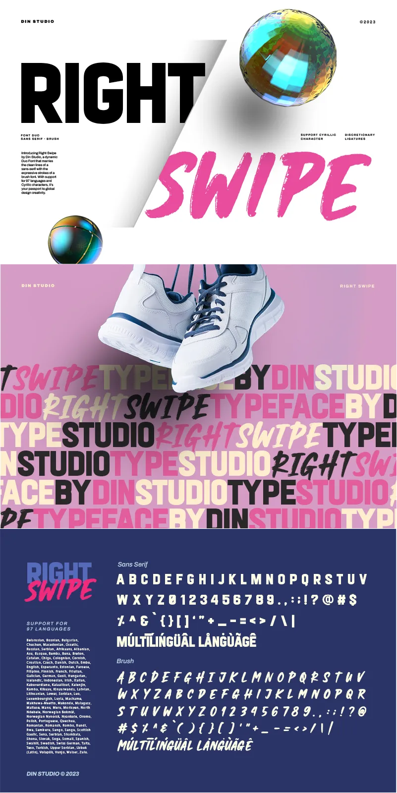 Right Swipe is a fantastic sans serif brush font duo. The sans serif font, in the Right Swipe, is the epitome of simplicity and elegance. Designed in uppercase, it boasts clean lines and a minimalist aesthetic, making a versatile look. This sans serif typeface is all about timeless sophistication and modern appeal. In contrast to its sans serif, the brush font adds a touch of creativity and spontaneity to