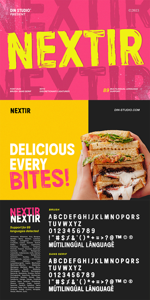 The combination of large letters, thick weight, square shapes, and brush detailing creates a font that makes a striking statement with a contemporary edge. When you need a typeface that combines strength with artistic expression, Nextir is the perfect choice to infuse your designs with boldness, modernity, and a touch of handcrafted elegance. You can also enjoy the features here.