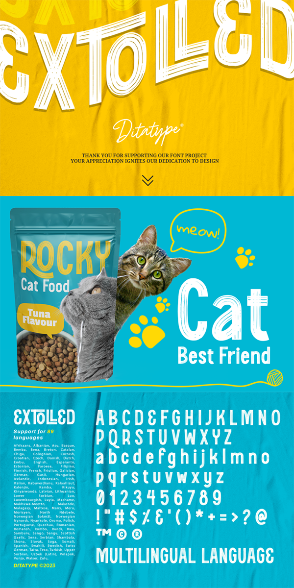Extolled fits in headlines, logos, posters, flyers, branding materials, print media, editorial layouts, and many more designs. Find out more ways to use this font by taking a look at the font preview.