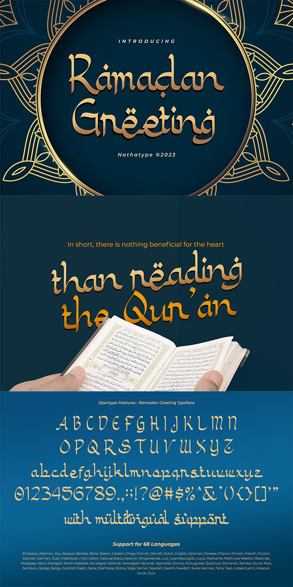 Ramadan Greeting fits in headlines, logos, posters, flyers, branding materials, greeting cards, print media, editorial layouts, and many more designs. Find out more ways to use this font by taking a look at the font preview.