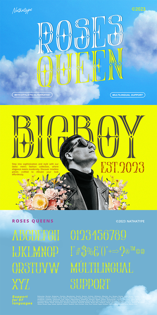 Roses Queen fits in headlines, logos, posters, flyers, branding materials, greeting cards, print media, editorial layouts, and many more designs. Find out more ways to use this font by taking a look at the font preview.