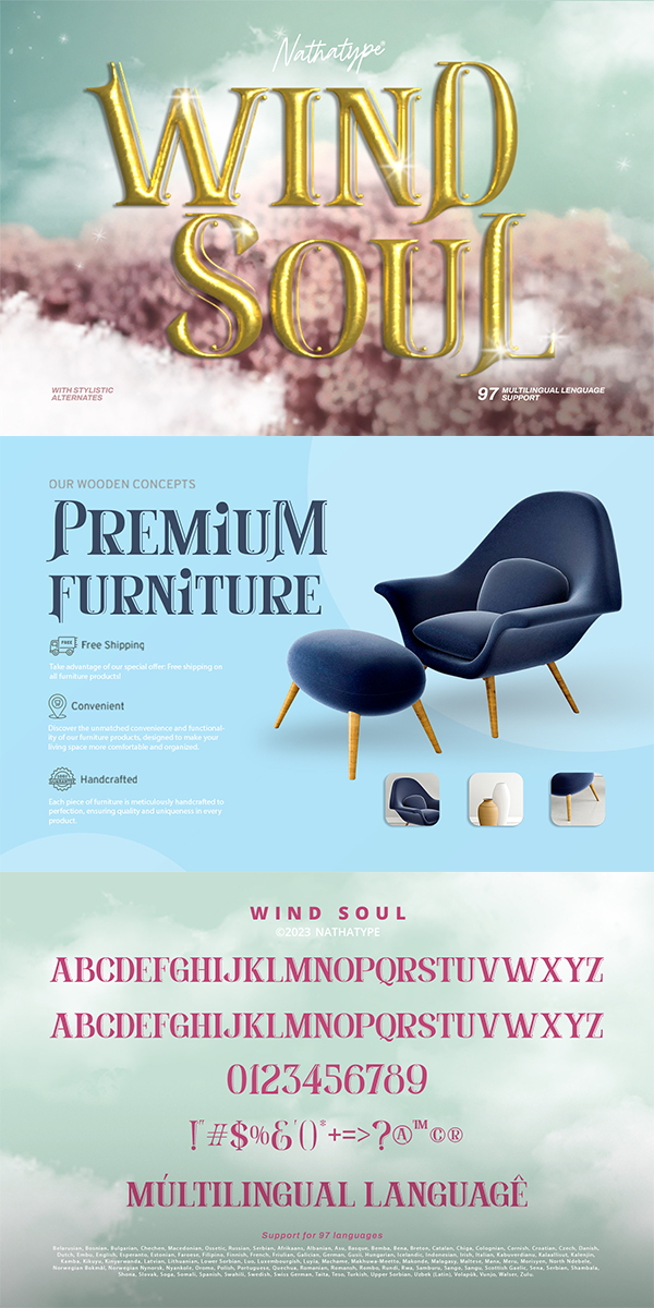 Wind Soul fits in headlines, logos, posters, flyers, branding materials, greeting cards, print media, editorial layouts, and many more designs. Find out more ways to use this font by taking a look at the font preview.