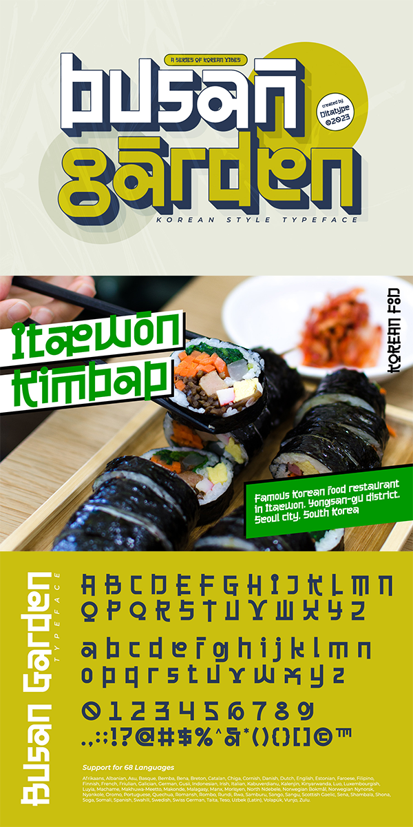 The characters in Busan Garden stand tall with a robust and thick weight, portraying a sense of confidence and solidity. The sturdy letterforms, characterized by sharp angles, create a visually striking appearance that captures the dynamic energy found in Korean design. Busan Garden is not just a font; it’s a visual journey through the streets of Busan. In addition, enjoy the features here.