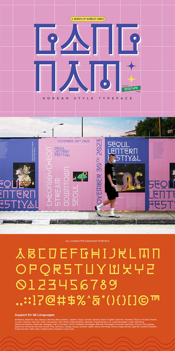 The characters in Gangnam showcase a unique Korean touch, capturing the essence of the dynamic and stylish district. The large letters, while not bold, maintain a visible presence, creating an overall design that is both graceful and attention-grabbing. Gangnam is not just a font; it’s a visual journey through the eclectic streets of Gangnam. In addition, enjoy the features here.
