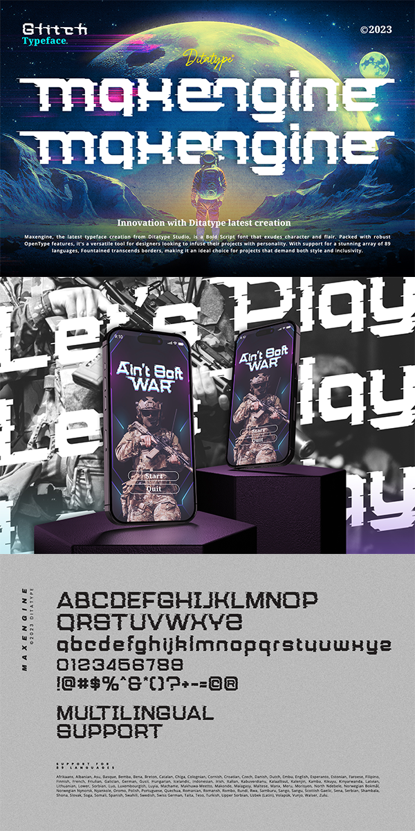 The characters in Maxengine boast a rounded shape, bringing a sense of friendliness and approachability to the bold script. What truly sets it apart is the intentionally uneven outline details, adding an element of creative flair to each letter. This unconventional approach results in a font that exudes personality and breaks away from the ordinary. In addition, enjoy the features here.