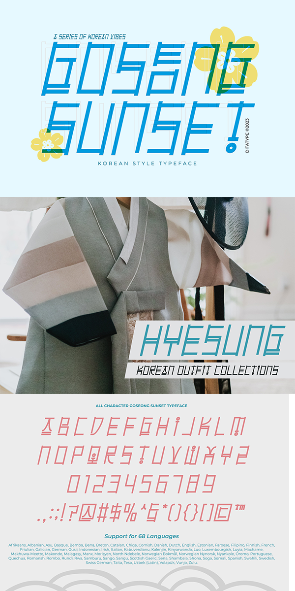 Goseong Sunset fits in headlines, logos, posters, flyers, branding materials, greeting cards, print media, editorial layouts, and many more designs. Find out more ways to use this font by taking a look at the font preview.