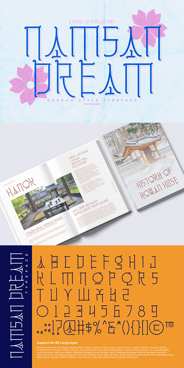 Namsan Dream fits in headlines, logos, posters, flyers, branding materials, greeting cards, print media, editorial layouts, and many more designs. Find out more ways to use this font by taking a look at the font preview.