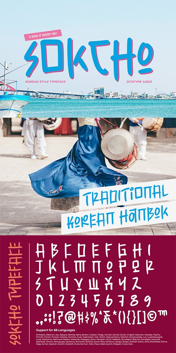 What makes Sokcho particularly captivating is the irregularity in the proportions of its letters. The varied letter sizes create a rhythmic flow in written content, reminiscent of the lively streets and diverse landscapes of Sokcho city. This playful inconsistency in the font resonates with the creative spirit of contemporary design trends. Inspired by traditional Korean calligraphy and integrated with a modern design approach, Sokcho transcends cultural boundaries. In addition, enjoy the features here.