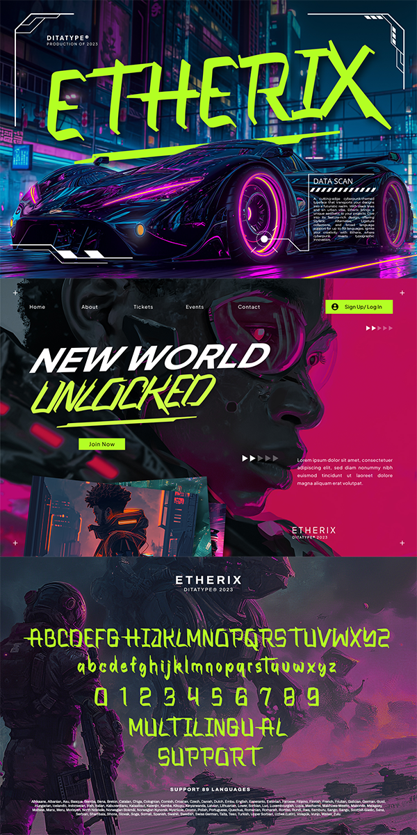 Etherix fits in headlines, logos, posters, flyers, technology branding, sci-fi book covers, futuristic UI/UX design, editorial layouts, and many more designs. Find out more ways to use this font by taking a look at the font preview.