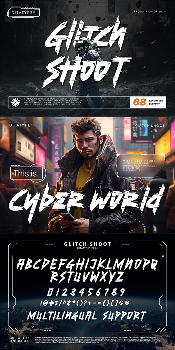 Crafted exclusively in uppercase, each letter boasts uniform proportions, enhancing its bold and impactful presence. However, what sets Glitch Shoot apart is its deliberate departure from clean outlines, embracing the chaotic allure of digital glitches. The font’s design evokes the feeling of a neon-lit metropolis, where technology and chaos coalesce into a stunning visual symphony. In addition, enjoy the features here.