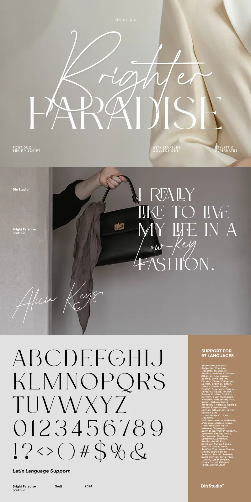 Brighter Paradise, a captivating duo font that combines the timeless serif with the graceful script. The serif font in Brighter Paradise exudes classic beauty with its uppercase letters. Each letter is meticulously crafted to embody grace and sophistication, making it ideal for adding a touch of timeless elegance. Complementing the serif font is the script font, designed to resemble cursive handwriting with its fluid strokes and elegant curves. This script font adds a sense of personal touch to the designs.
