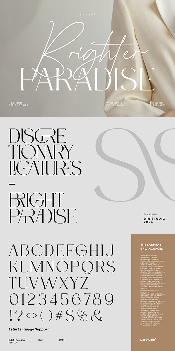 Complementing the serif font is the script font, designed to resemble cursive handwriting with its fluid strokes and elegant curves. This script font adds a sense of personal touch to the designs. Together, the two fonts in Brighter Paradise create a perfect harmony, allowing designers to effortlessly blend classic sophistication with contemporary style. In addition, enjoy the features here.