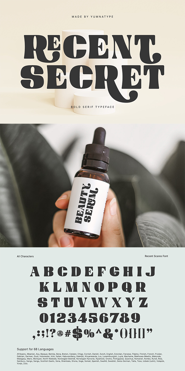 Recent Secret fits in headlines, logos, posters, flyers, branding materials, greeting cards, print media, editorial layouts, and many more designs. Find out more ways to use this font by taking a look at the font preview.