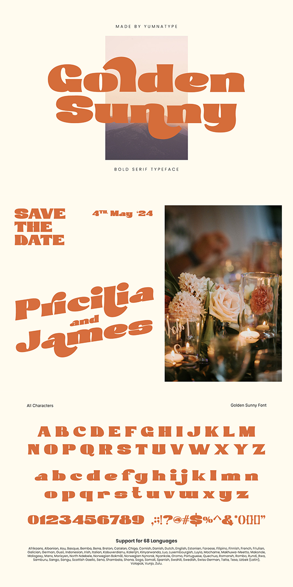 Golden Sunny fits in headlines, logos, posters, flyers, branding materials, greeting cards, print media, editorial layouts, and many more designs. Find out more ways to use this font by taking a look at the font preview.