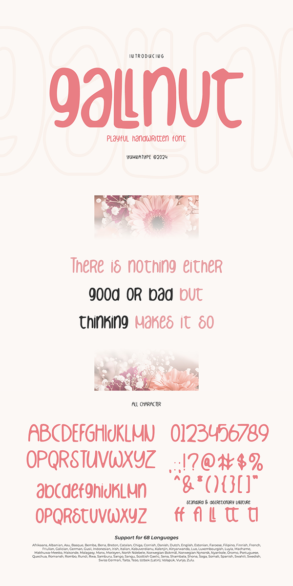 Gallnut is a delightful handwritten font that exudes playful charm and whimsy. At its core, Gallnut is crafted with a playful hand-drawn aesthetic, capturing the spontaneity and warmth of handwritten lettering. Each character is imbued with character and personality, adding a unique touch to every word.