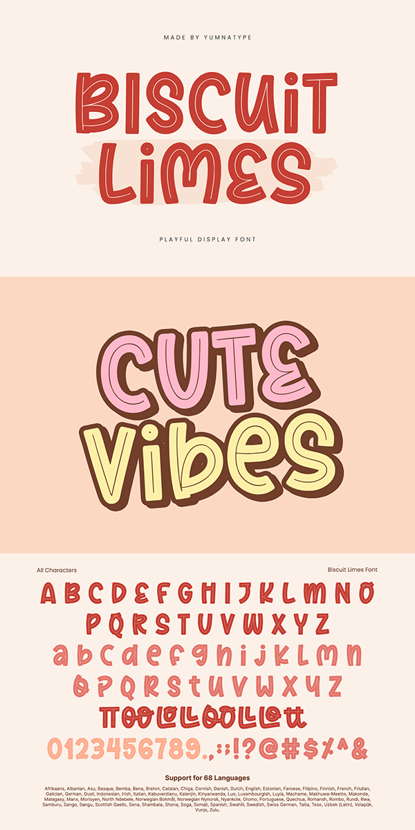 The slightly unequal proportions of the letters add to its playful charm, creating a dynamic rhythm that dances across the page. Despite its whimsical appearance, Biscuit Limes maintains a sense of versatility and adaptability. In addition, enjoy the features here.
