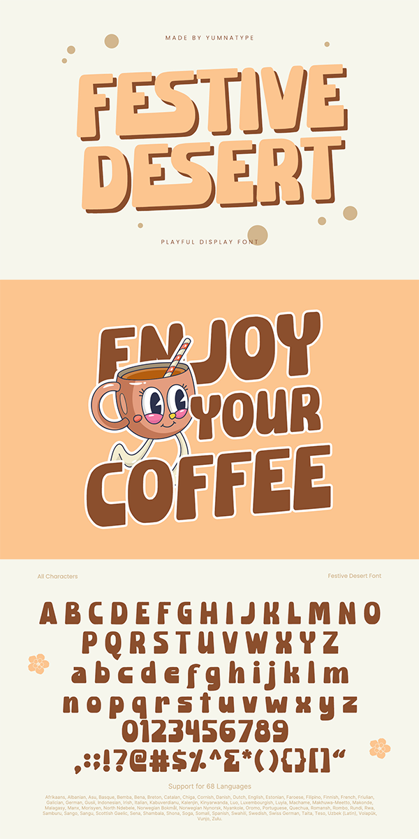 Festive Dessert fits in headlines, logos, posters, flyers, branding materials, greeting cards, print media, editorial layouts, and many more designs. Find out more ways to use this font by taking a look at the font preview.