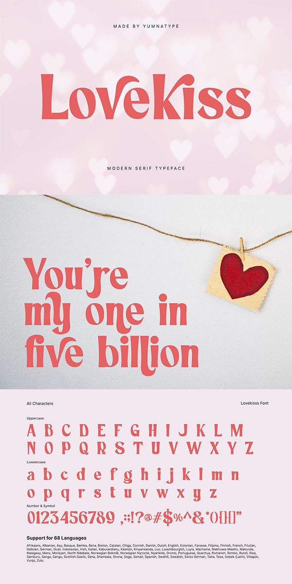 Lovekiss is a captivating serif font that seamlessly blends classic elegance with modern flair. Crafted in a contemporary style, this font exudes sophistication and charm. With its clean lines and balanced proportions, Lovekiss strikes the perfect balance between tradition and innovation.
