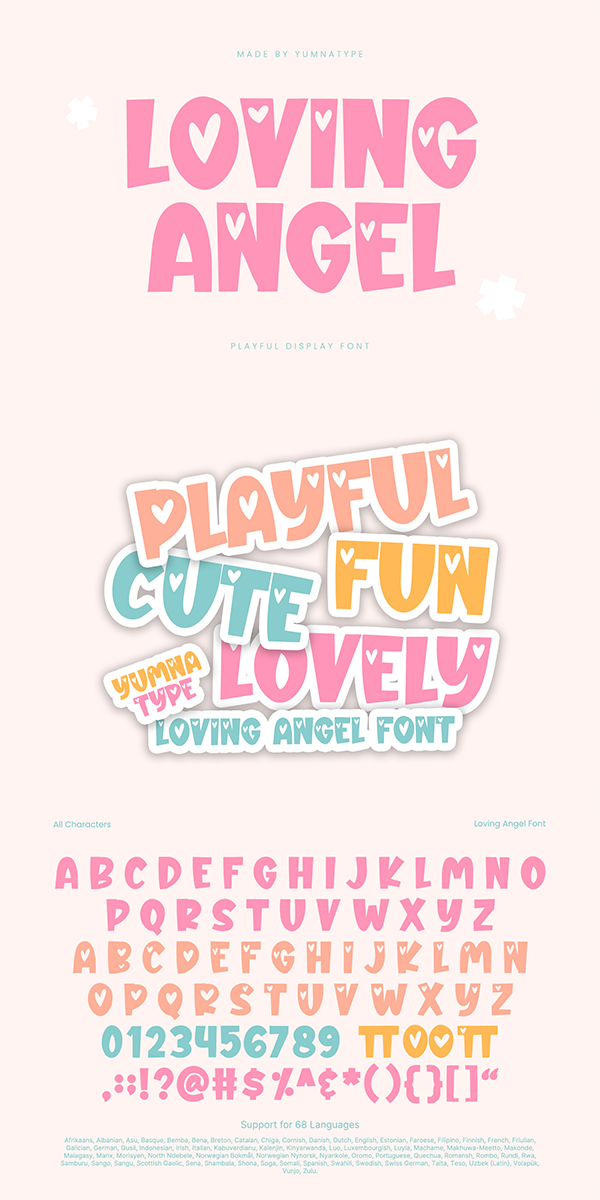 Loving Angel enchants with its playful style and rounded shapes, evoking a sense of childlike wonder and innocence. Each letter is meticulously designed to capture the whimsy of angelic beings, with rounded forms that invite viewers to embrace the magic of the moment. With its thick weight and low contrast, Loving Angel commands attention and ensures that your message is conveyed with clarity and confidence. In addition, enjoy the features here.