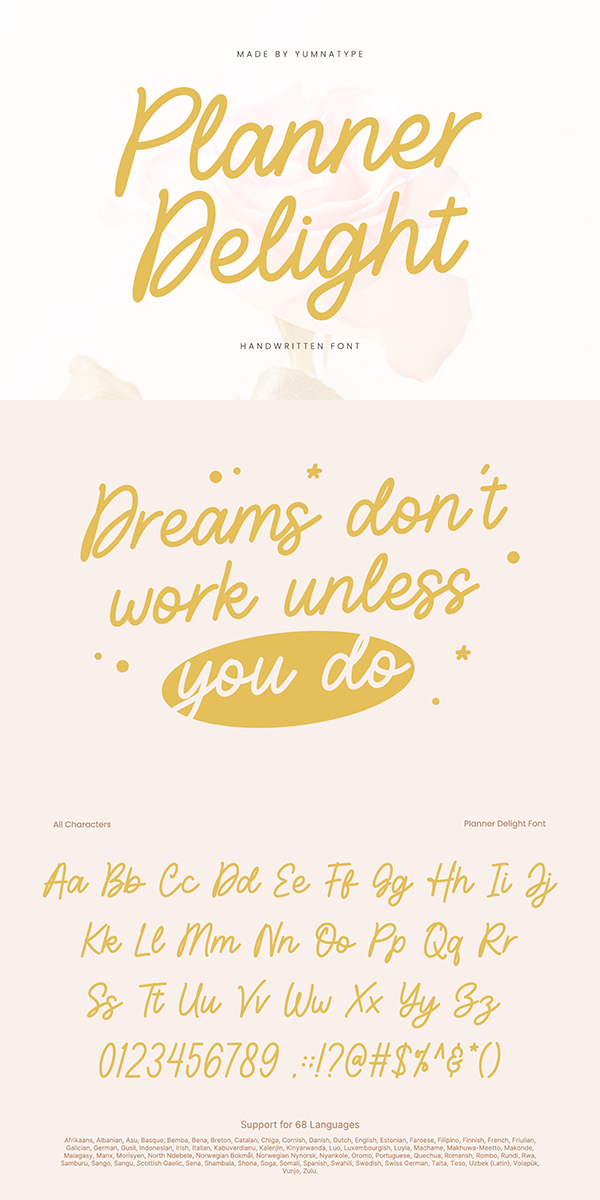 Planner Delight fits in headlines, logos, posters, flyers, branding materials, greeting cards, print media, editorial layouts, and many more designs. Find out more ways to use this font by taking a look at the font preview.