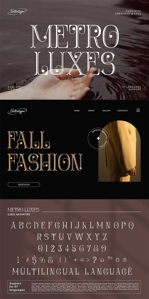 The letters are meticulously designed with a moderate thickness, ensuring readability. Metro Luxes shows delicate ornamentation at the end of each letter. These decorative elements add a sense of sophistication, making it stand out from traditional sans serif fonts. In addition, enjoy the features here.