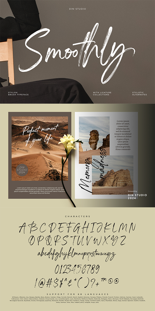 This variation in letter sizes adds a sense of movement and rhythm to your text, enhancing its visual appeal and drawing the viewer’s eye along the page. With its detailed brushwork and connected letters, Smoothly brings a sense of authenticity and warmth to your designs. In addition, enjoy the features here.