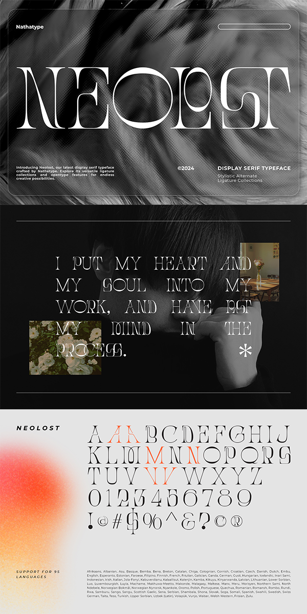 Neolost is a striking serif display font that commands attention with its bold design and unconventional style. Crafted in uppercases, this font exudes a sense of drama and intrigue. With its very thin weight and pronounced contrast between thick and thin strokes, Neolost captivates the eye and adds a sense of dynamism to your text.