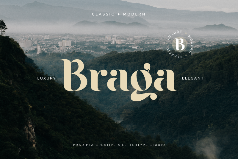 Braga is a serif font with modern, classic or vintage style. This font will be perfect for logo design, branding, clothing, signage, posters, wedding invitations and so much more! My goal in creating this font was to create a mix of serif fonts with modern and classic styles, which will help your project to be more perfect and beautiful. Don't Miss Out!