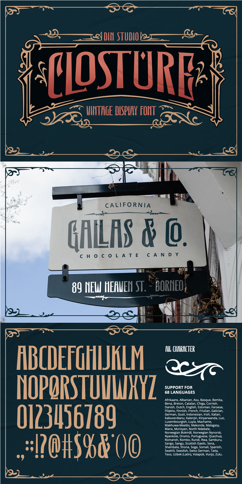 Introducing Closture-a vintage-inspired all-caps font that combines boldness with timeless elegance. Designed with a fairly bold weight, Closture stands out with its strong presence while maintaining consistent proportions for a balanced and harmonious look. This font channels a classic aesthetic that adds a touch of nostalgia to any design. As an extra, this font gives ornaments. In addition, enjoy the features here.