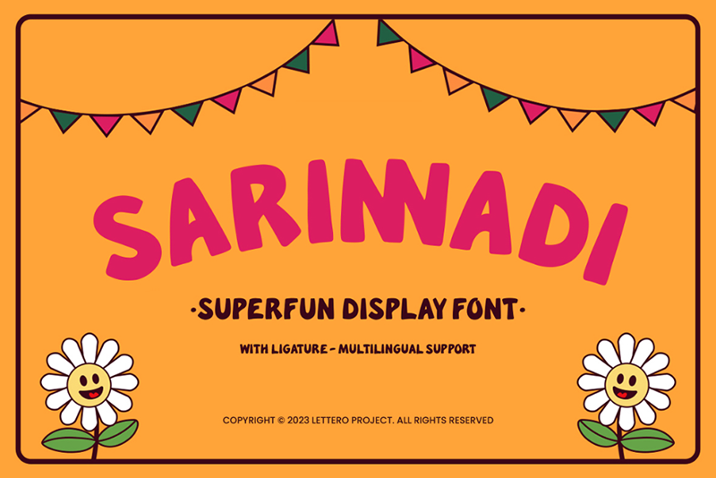 Sarinnadi is a superfun display font with chubby and rounded shape. Sarinnadi will look perfect for headline on many products like book, poster, sticker, t-shirt, logo, packaging, kids stuff, etc.