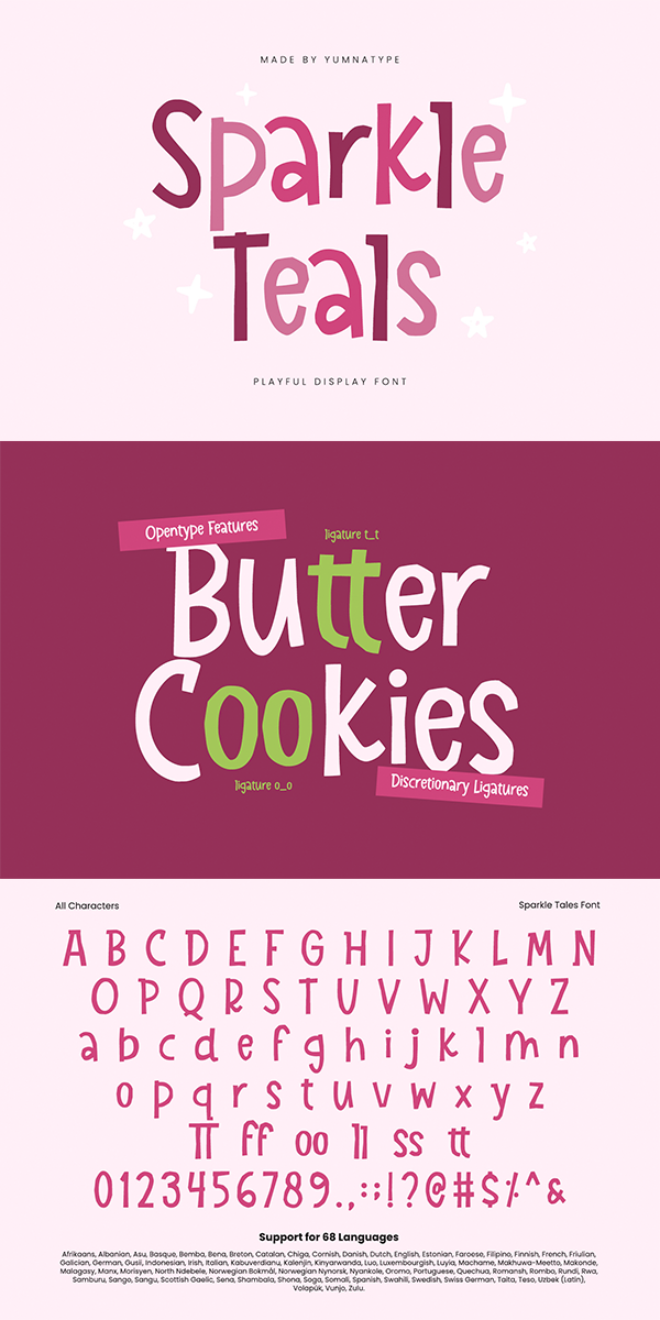Sparkle Teals fits in headlines, logos, posters, flyers, branding materials, greeting cards, print media, editorial layouts, and many more designs. Find out more ways to use this font by taking a look at the font preview.