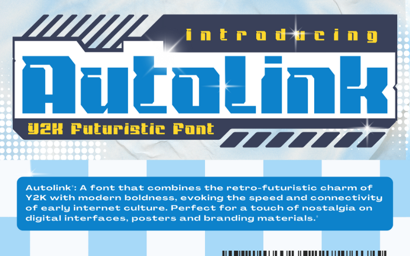 Introducing “Autolink,” a font that channels the futuristic vibes of the Y2K era. With its sleek and dynamic design, this font embodies the cutting-edge aesthetics of the early 2000s. Perfect for projects that seek to evoke a sense of futuristic nostalgia, such as posters, digital artwork, or branding materials. “Autolink” adds a touch of retro-futurism to your text, transporting your audience back to the Y2K era while still feeling fresh and modern.