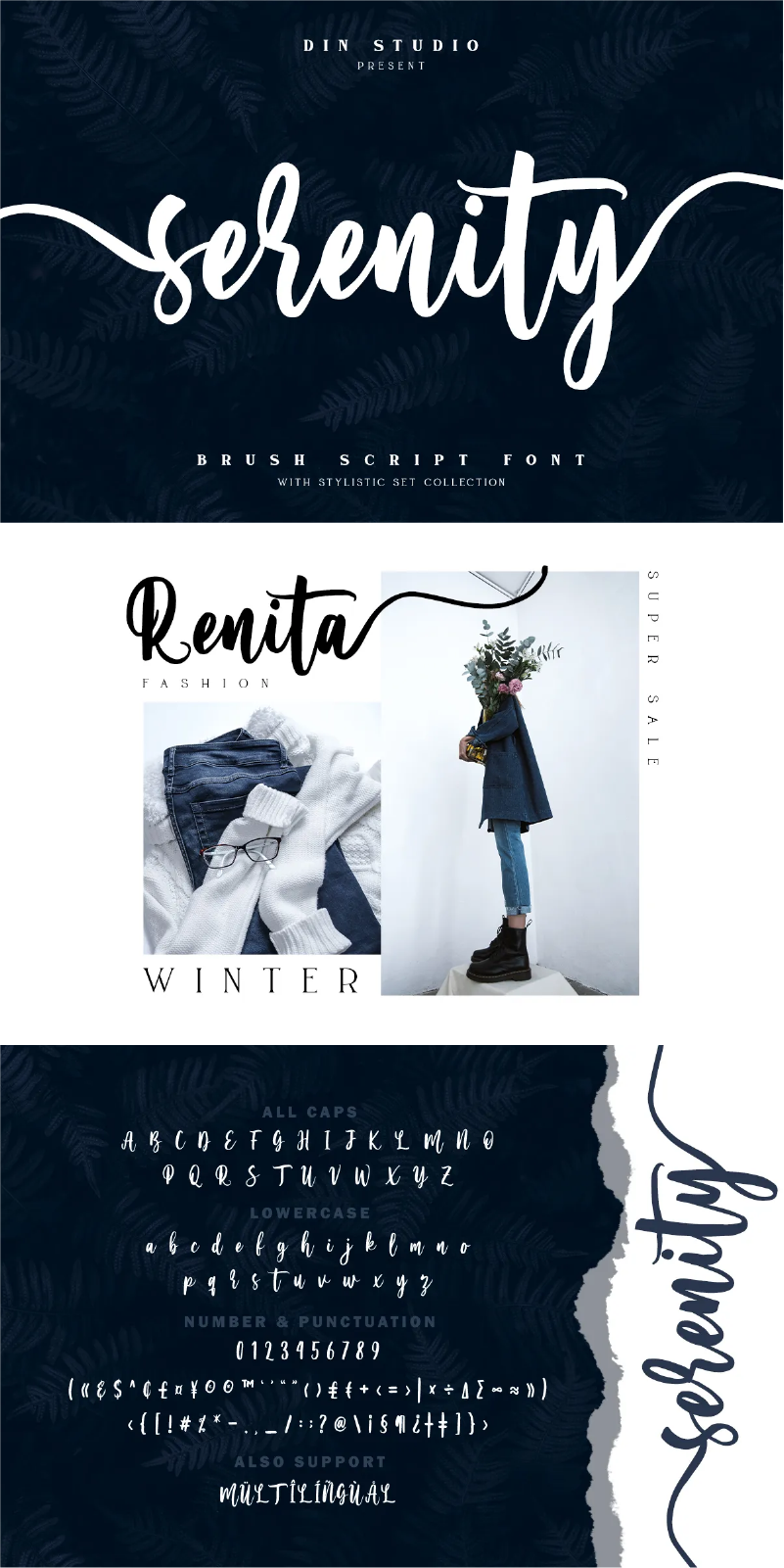 What sets Serenity apart is its subtle brush detail, which adds an extra layer of depth and texture to the font. These delicate brush accents add a touch of warmth and character, giving the font a handcrafted feel that is both timeless and inviting. In addition, enjoy the features here.